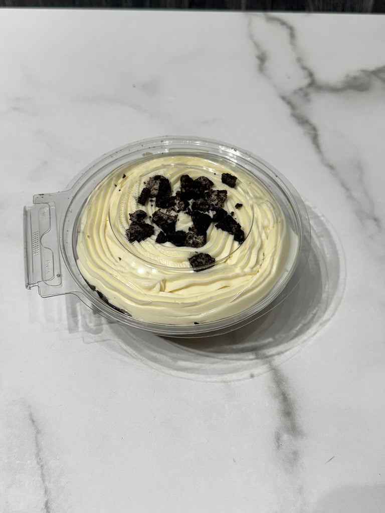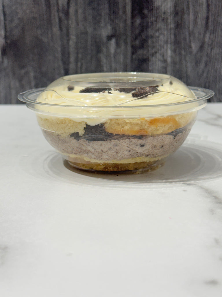 A rich caramel toffee cookie base layered with buttery burnt butter cake, cookies-and-cream cheesecake mousse, crushed chocolate cookies, and fluffy whipped cream — a decadent spin on the classic cookies-and-cream favorite.